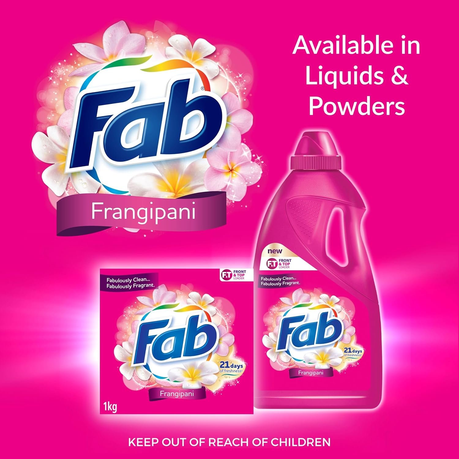 Let Fab take you on a journey of sensorial delight! The rich scent of Fab Frangipani captures the fresh and clean fragrance of frangipani flowers on a warm summer’s day. You love the smell of clean clothes but would like it to last longer? Rediscover Fab laundry detergents, your best allies to enjoy fabulously cleanFabulously fragrant laundry even after 21 days ! Indulge your senses, and Let Fab world of fragrances take you on a journey of sensorial delight. up to 28 days of freshness when stored in a cupboard under ordinary conditions after launderingFrom the manufacturer